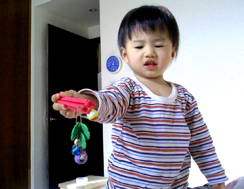 這是妞最近很熱衷的玩法,把我在IKEA買的夾子(封塑膠袋的)拿來夾東西。那彩色一串的,是從前年少不經事,花大把銀子珍藏的扭蛋玩具,現在全變成妞的。妞很得意地把東西夾上夾下,從一個盒子夾到另一個盒子放,因為可以讓這孩子認真地玩很久,就,讓她玩吧!